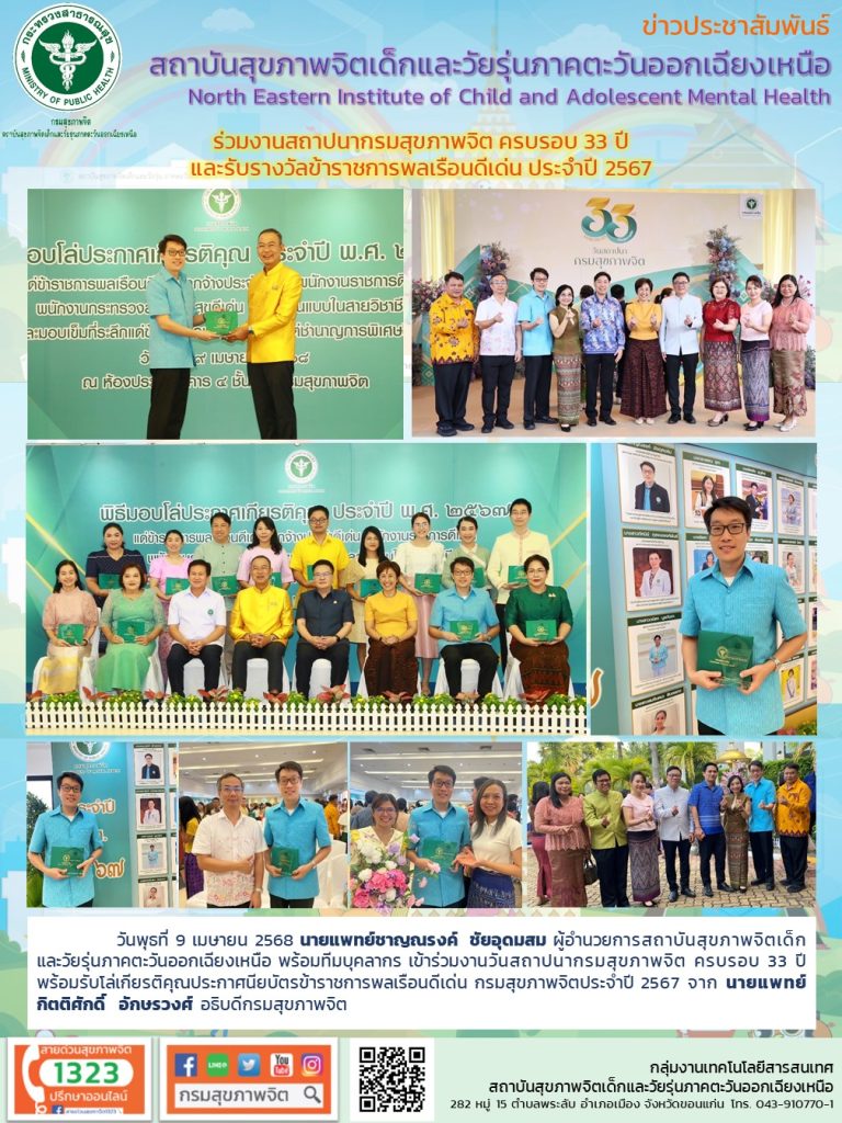 ร่วมงานสถาปนากรมสุขภาพจิต ครบรอบ 33 ปี และรับรางวัลข้าราชการพลเรือนดีเด่น ประจำปี 2567 Wednesday April 9th, 2025admin