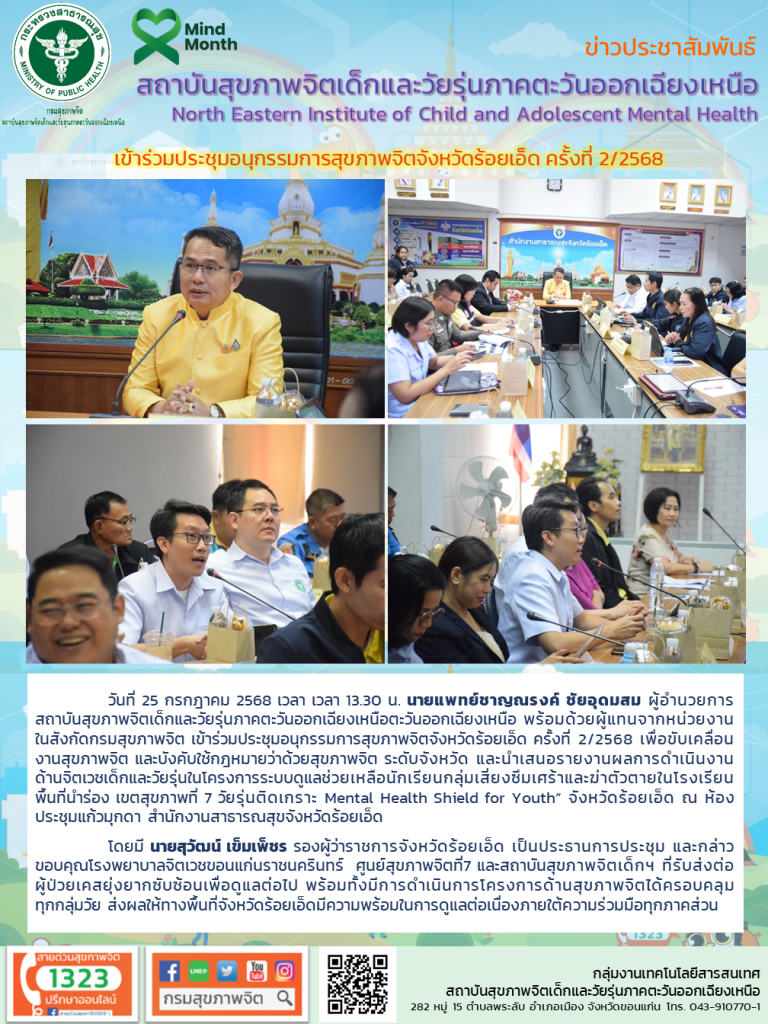 เข้าร่วมประชุมอนุกรรมการสุขภาพจิตจังหวัดร้อยเอ็ด ครั้งที่ 2/2568 Friday July 25th, 2025Friday July 25th, 2025admin
