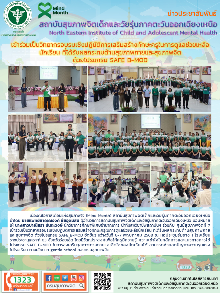 เข้าร่วมเป็นวิทยากรอบรมเชิงปฏิบัติการเสริมสร้างทักษะครูในการดูแลช่วยเหลือนักเรียน ที่ได้รับผลกระทบด้านสุขภาพกายและสุขภาพจิต ด้วยโปรแกรม SAFE B-MOD Wednesday May 7th, 2025Wednesday May 7th, 2025admin