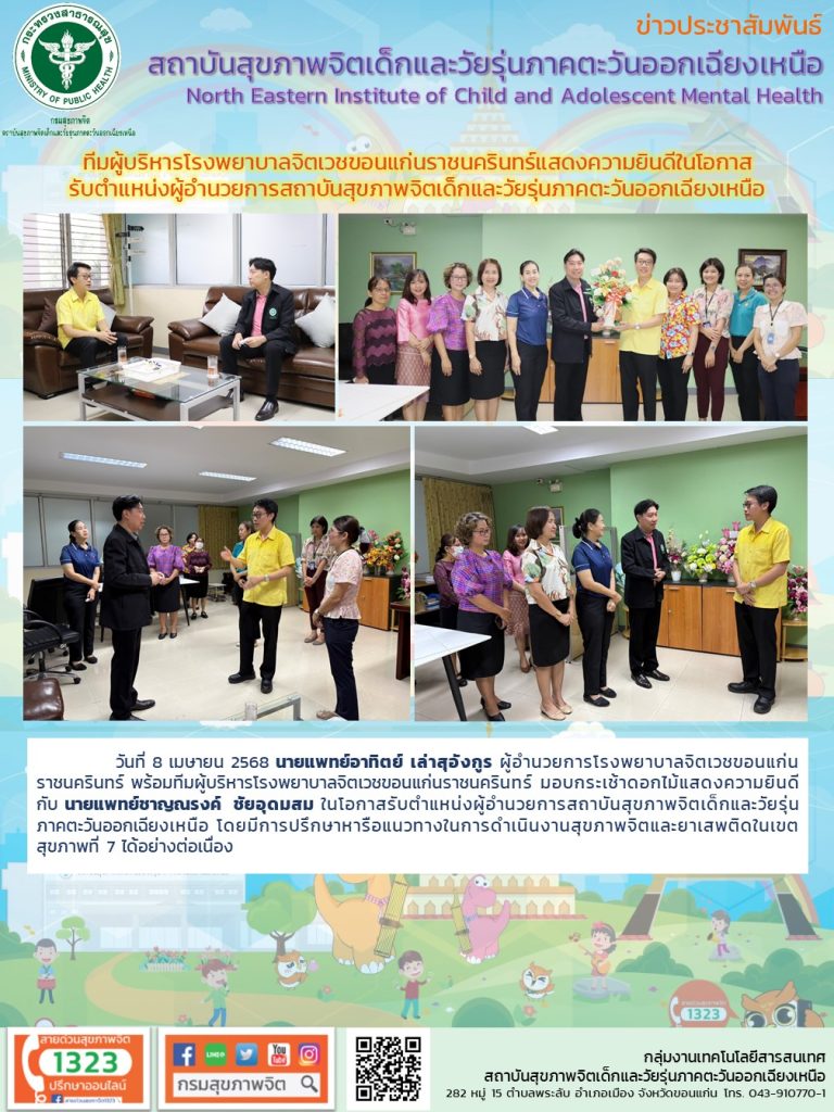 ทีมผู้บริหารโรงพยาบาลจิตเวชขอนแก่นราชนครินทร์แสดงความยินดีในโอกาสเข้ารับตำแหน่งผู้อำนวยการสถาบันสุขภาพจิตเด็กและวัยรุ่นภาคตะวันออกเฉียงเหนือ Tuesday April 8th, 2025Tuesday April 8th, 2025admin
