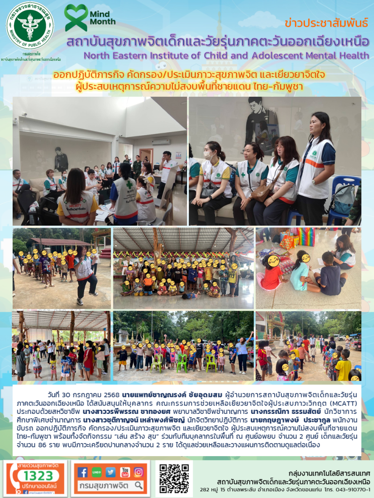 ออกปฏิบัติภารกิจ คัดกรอง/ประเมินภาวะสุขภาพจิต และเยียวยาจิตใจ ผู้ประสบเหตุการณ์ความไม่สงบพื้นที่ชายแดน ไทย-กัมพูชา