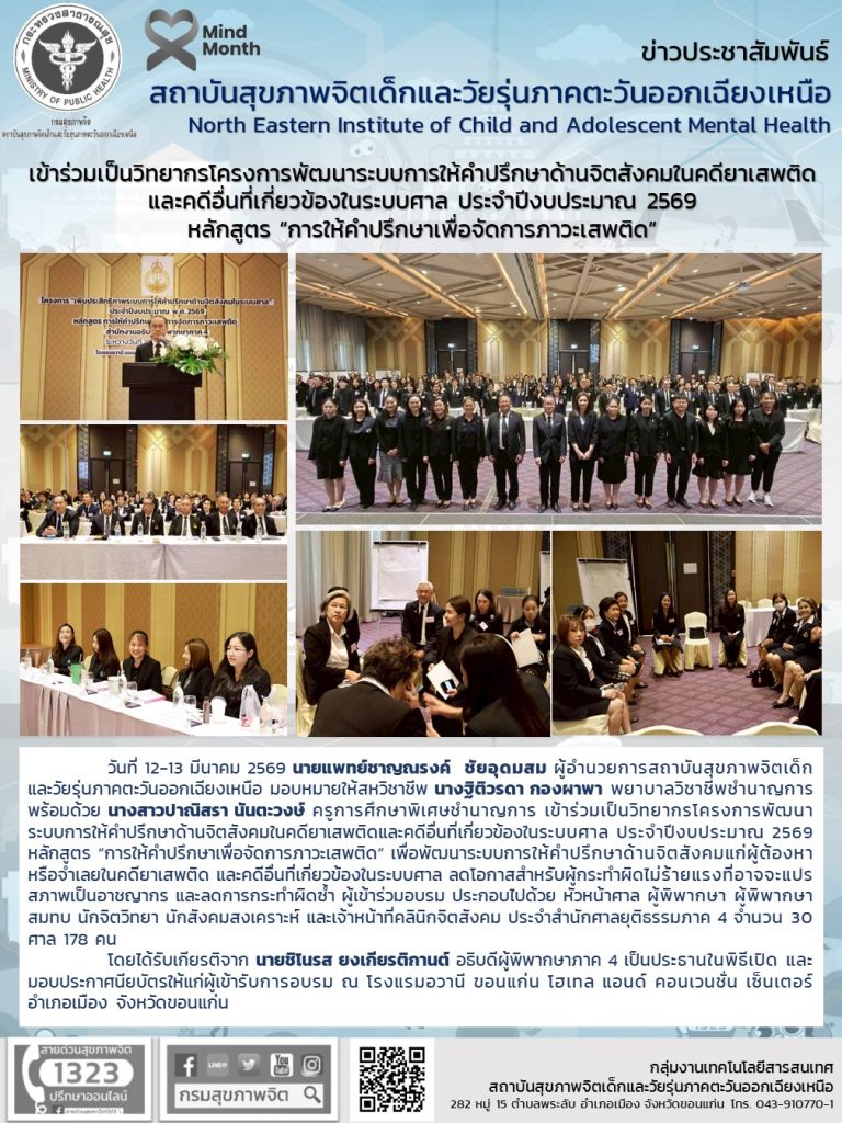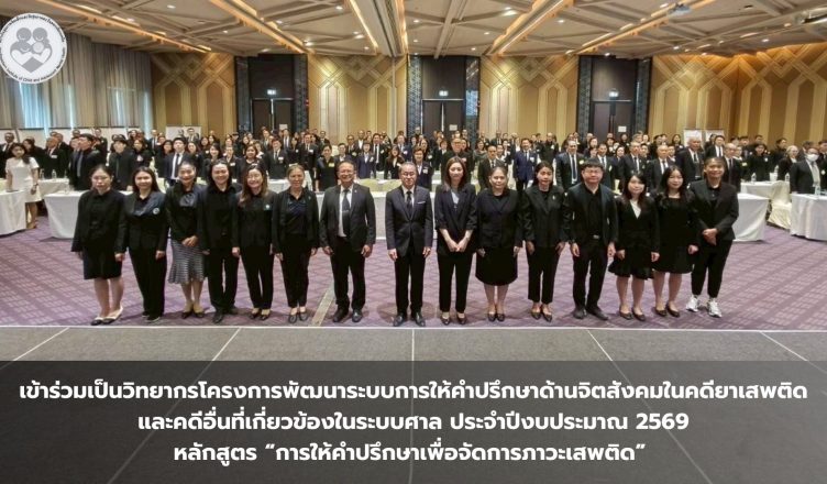 เข้าร่วมเป็นวิทยากรโครงการพัฒนาระบบการให้คำปรึกษาด้านจิตสังคมในคดียาเสพติดและคดีอื่นที่เกี่ยวข้องในระบบศาล ประจำปีงบประมาณ 2569 หลักสูตร การให้คำปรึกษาเพื่อจัดการภาวะเสพติด Monday March 16th, 2026admin