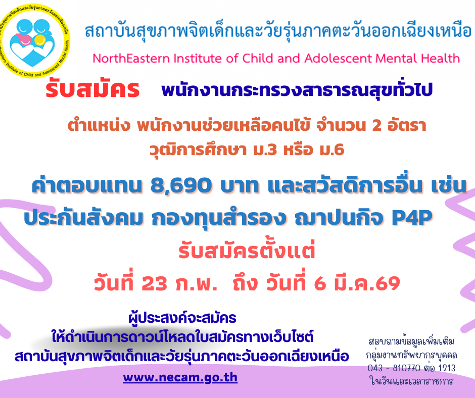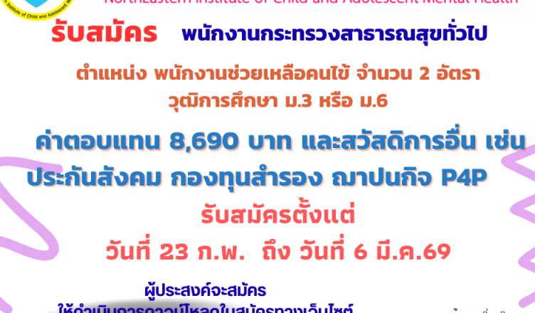 ประกาศรับสมัครบุคคลเพื่อสรรหาและเลือกสรรเป็นพนักงานกระทรวงสาธารณสุขทั่วไป ตำแหน่ง พนักงานช่วยเหลือคนไข้ จำนวน ๒ อัตรา ค่าตอบแทน ๘,๖๙๐ บาท Wednesday February 18th, 2026Wednesday February 18th, 2026admin Loading… Taking too long? Reload document | Open in new tab Download [2.28 MB] Loading… Taking too long? Reload document | Open in new tab Download [181.20 KB] Loading… Taking too long? Reload document | Open in new tab Download [89.06 KB]